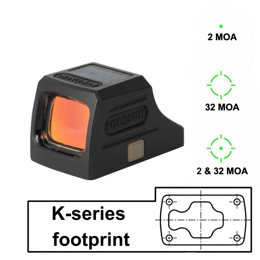 The SCS-CARRY (Solar Charging Sight) is a direct attachment optic for slim, carry-sized sub-compact handguns. It is designed to attach directly to HOLOSUN-K slide cuts, or to RMSc cut slides with the included adapter plate. The SCS-CARRY uses our innovative solar charging system with multi-directional light sensors to automatically adjust brightness in dynamic lighting situations. The SCS can potentially operate indefinitely with its internal, rechargeable 20,000-hour battery.